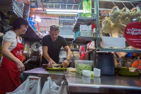 享受鸡饭最好的地方是在新加坡的一个无处不在的露天“小贩中心”,就像商场美食广场,但充满了神奇的咖喱面条和烤肉站而不是阿姨安妮的椒盐卷饼和橙色朱利叶斯。