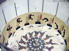 对于一个特定的西洋镜praxinoscope中间,有一个镜像鼓,这样你可以看到照片通过装置的顶部。鼓上的图片改变从一个到另一个。通过旋转鼓,可以使照片快速行动足以欺骗你的眼睛是看一个电影。这些照片通常是一些重复的运动,比如一个人走路或跳舞,因为这个运动毛圈很容易。毛圈条的图片,本系列的最后一张照片几乎匹配第一个,所以图像将创建一个模拟的单周期运动,可以无限重复产生持续运动的错觉。